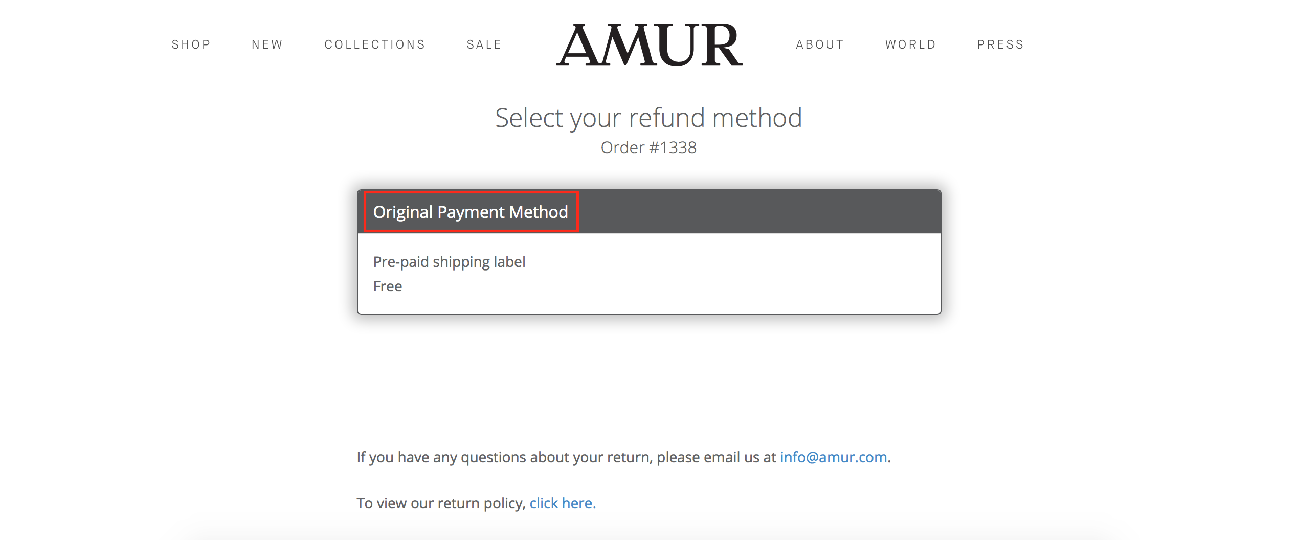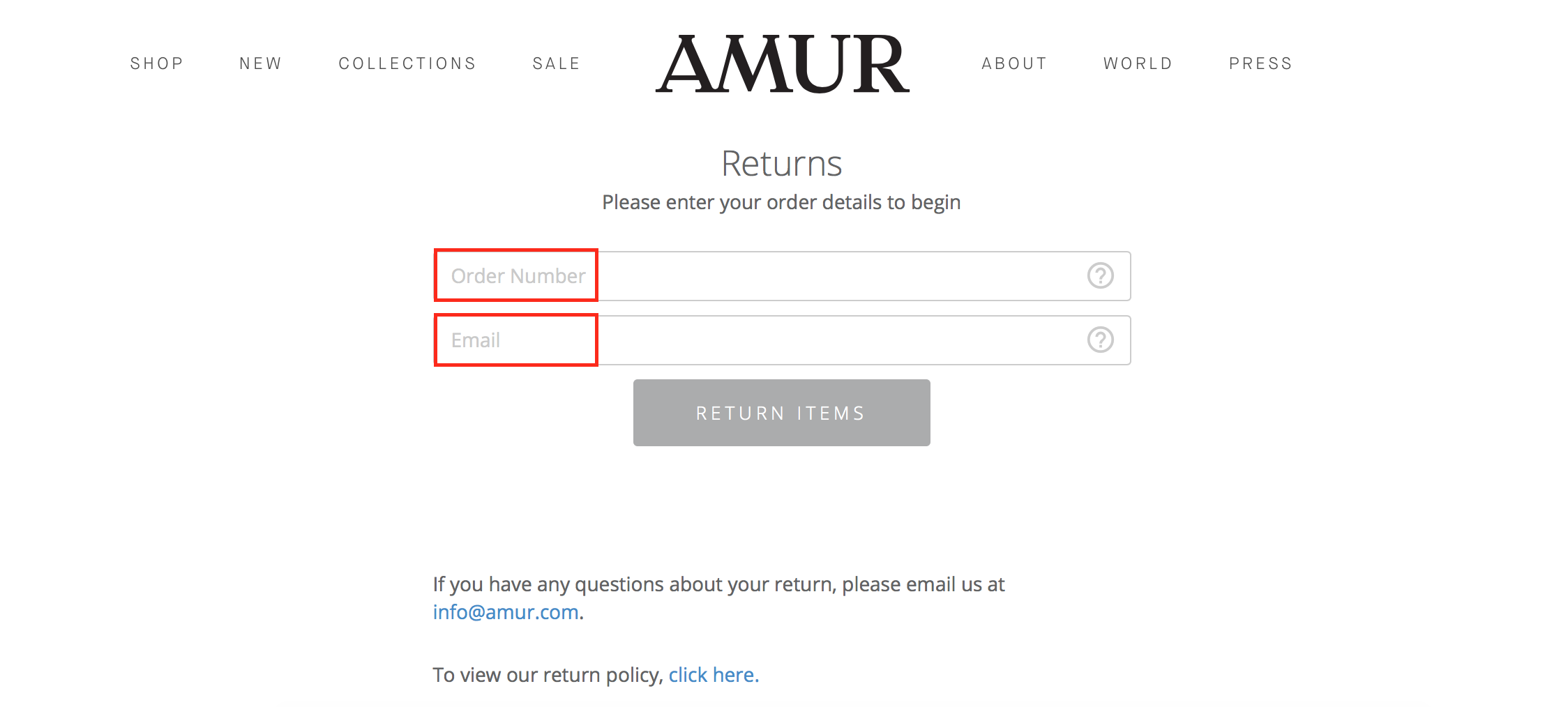 Return labels are generated automatically on the website at https://amur.com/a/returns. Customers have 14 days to return an item. You can find our return policy here: https://amur.com/pages/shipping-and-returns
